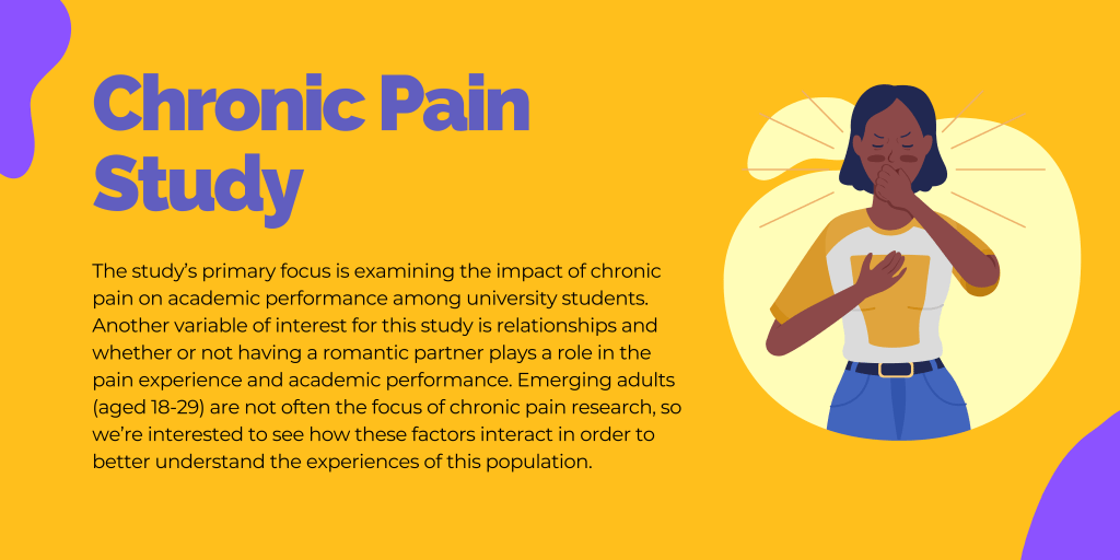 The study’s primary focus was examining the impact of chronic pain on academic performance among university students. Another variable of interest for this study was relationships and whether or not having a romantic partner plays a role in the pain experience and academic performance. Emerging adults (aged 18-29) are not often the focus of chronic pain research, so we were interested to see how these factors interact in order to better understand the experiences of this population. Recruitment is now closed.